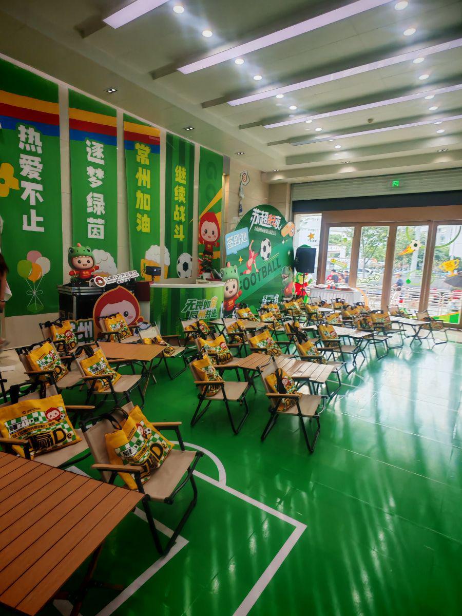 在网点的侧面,记者见到了一个小型的模拟足球场,路过的行人都可以来上一脚,体验一下足球运动员射门的快乐。而在网点内部,记者发现了一个布置精美的“苏超”观赛区,20余张折叠椅面对着一张100寸左右的大屏幕,墙上还挂着“逐梦绿荫”“常州加油”的应援标语,附近还设有餐食区为观赛观众供应水果、蛋糕和饮料。